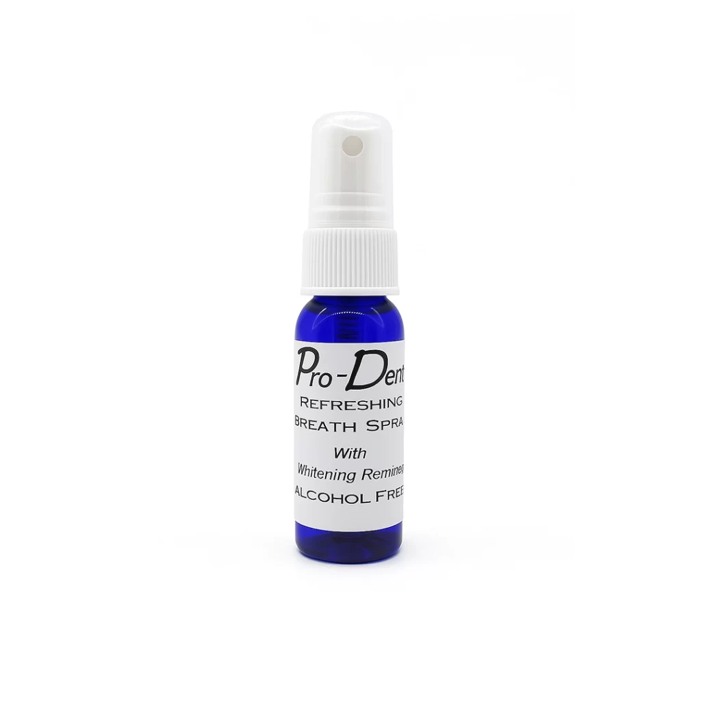 Oral spray for promoting fresh breath. Breath Spray liquid is dark purple. 1oz. Bottle is blue.